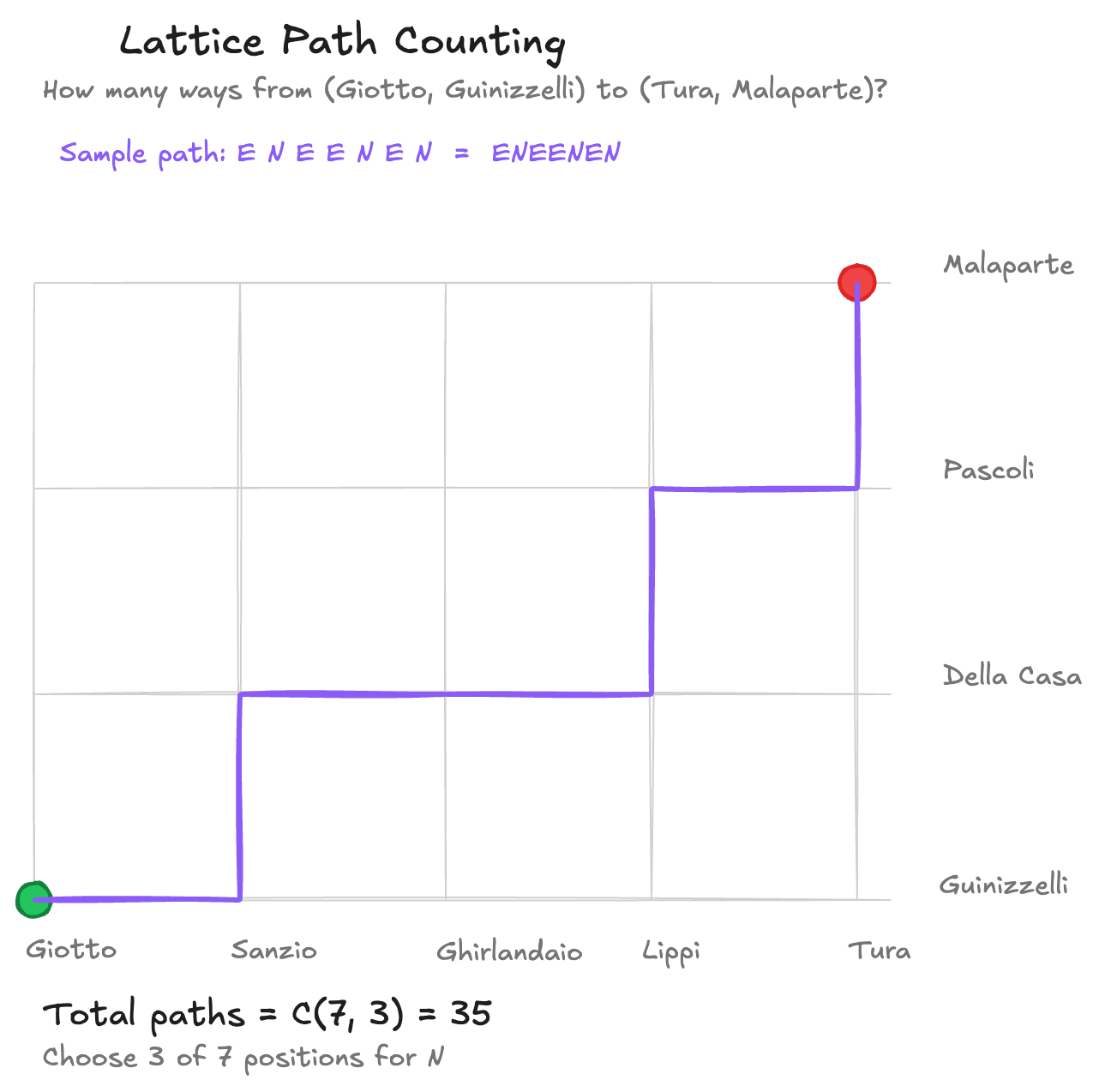 But the ordering that matters in path counting problems is the ordering of the whole arrangement, whilst the first in actually gets rid of ordering within the chosen elements’ set. In other words, I’m not choosing which North step goes into step , I’m choosing whether step gets a North or an East step: I’m choosing the positions not the elements that need to be instead considered indistinguishable.